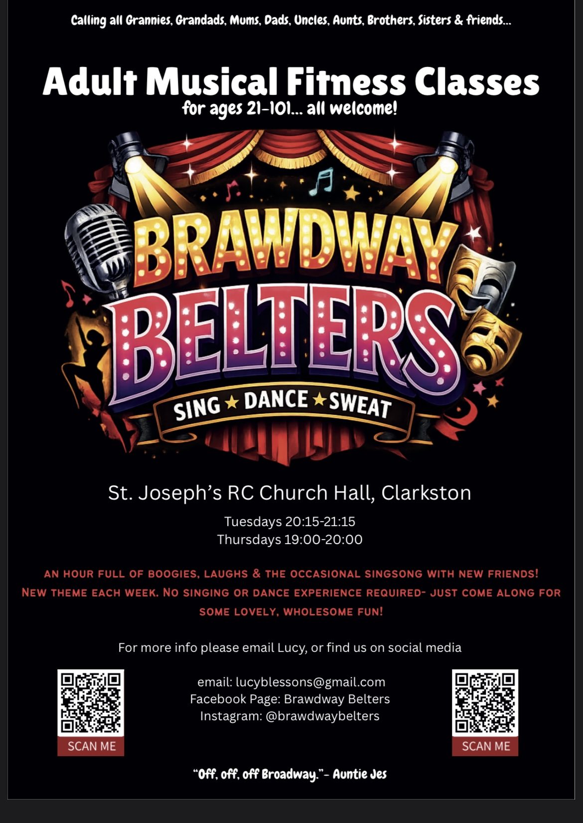 Brawdway Belters was created to redefine fitness by blending the excitement of musical theatre with approachable exercise. Our mission is to wake up the playful child in us, build an inclusive community where adults of all abilities can express themselves, stay active, and gain confidence through performance-inspired workouts that uplift moods and bring lots of joy!